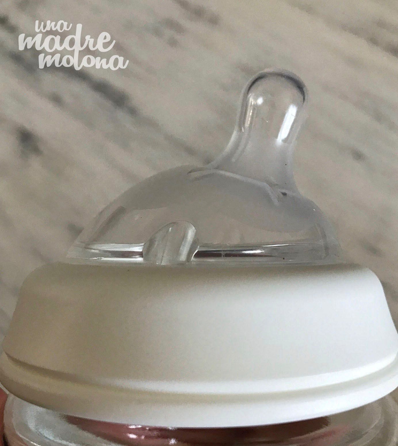 El tema tetinas da para hacer un doctorado, jaja… Aquí, en Villa Molona, triunfa la silicona por encima del látex y las tetinas les han gustado a los tres siempre como más planitas. Pero hemos descubierto otra que parece estar teniendo buena aceptación por parte de minimolona. Ha sido, precisamente, la del biberón que viene con el sacaleches que os comentaba. Aunque no está como aplanada, sí tiene una forma muy similar al pezón y viene ladeada. ¡Os dejo foto porque me explico fatal!