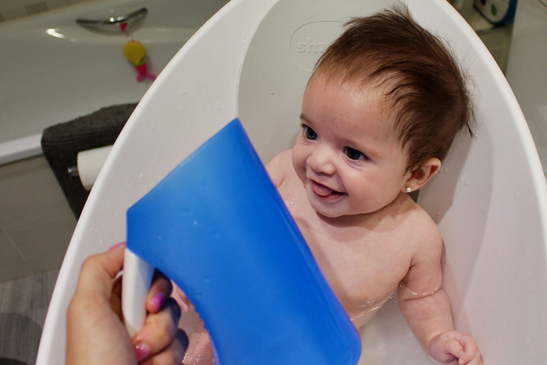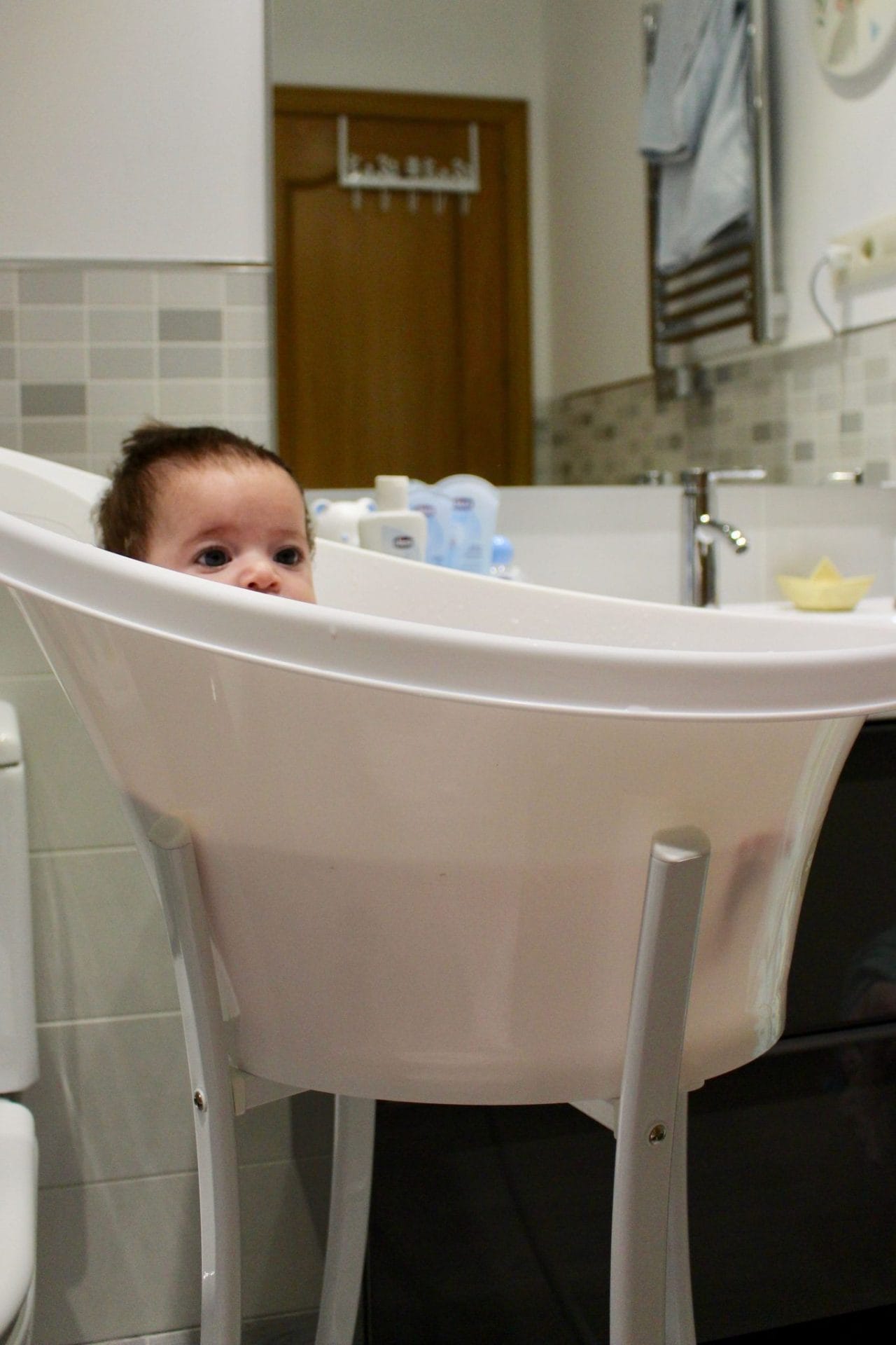 Pero, con el positivo en el test de embarazo, empecé a buscar nuevas soluciones para nuestro nuevo baño (que no es enano pero tampoco es grande). En un principio utilicé una bañera plegable a ras del suelo, pero no me apañaba nada bien con ella porque me obligaba a agacharme, dejándome las cervicales, y a sujetar al bebé constantemente, sin dejarme ni una mano libre para coger el gel, echarlo, aclarar, etc. Finalmente, llegó a mis manos la bañera shnuggle y ha sido un acierto total. Las patas se pliegan y las puedo apoyar en la pared detrás de la puerta. Su forma permite mantener al bebé sentado y eso me da tregua para tener manos libres, aunque no te puedes despistar ni un segundo, evidentemente, pero tengo margen para enjabonar, enjuagar y coger la toalla. Aquí tenéis a la molona disfrutando de su particular “spa”.